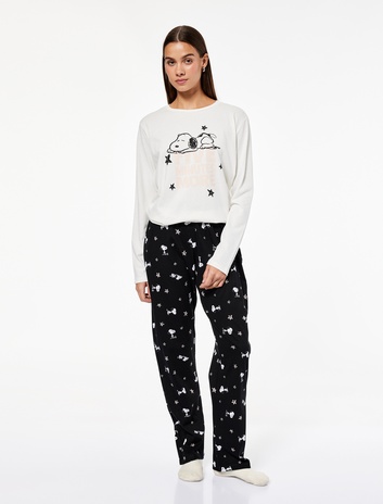 Snoopy Baskılı Lisanslı Uzun Kollu Bisiklet Yaka Pamuklu Pijama Takımı