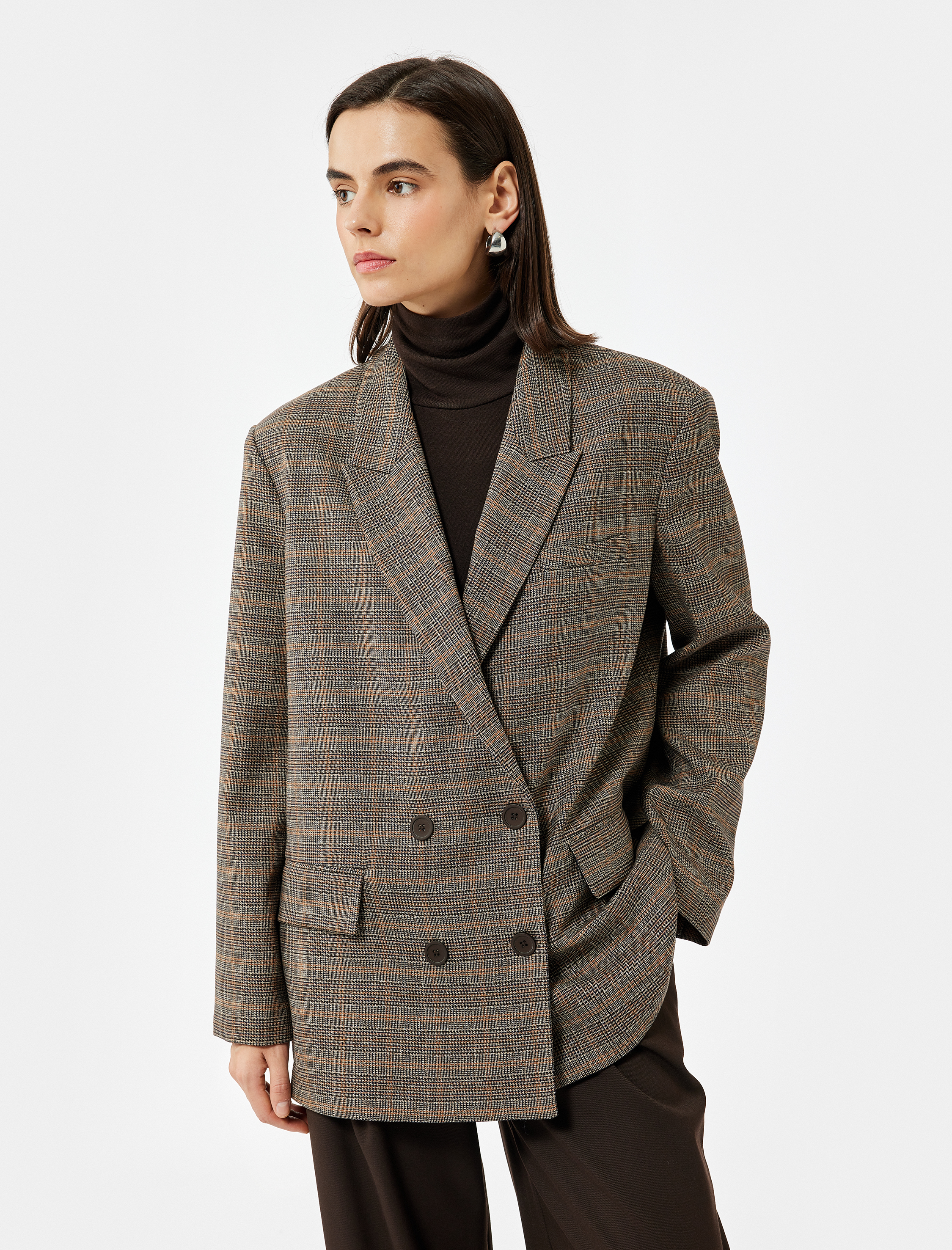 Kapaklı Cep Detaylı Düğmeli Uzun Kollu Kruvaze Ekose Blazer Ceket