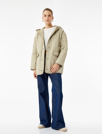Uzun Kollu Düğmeli Kapşonlu Kapitone Mont Sepete Ekle