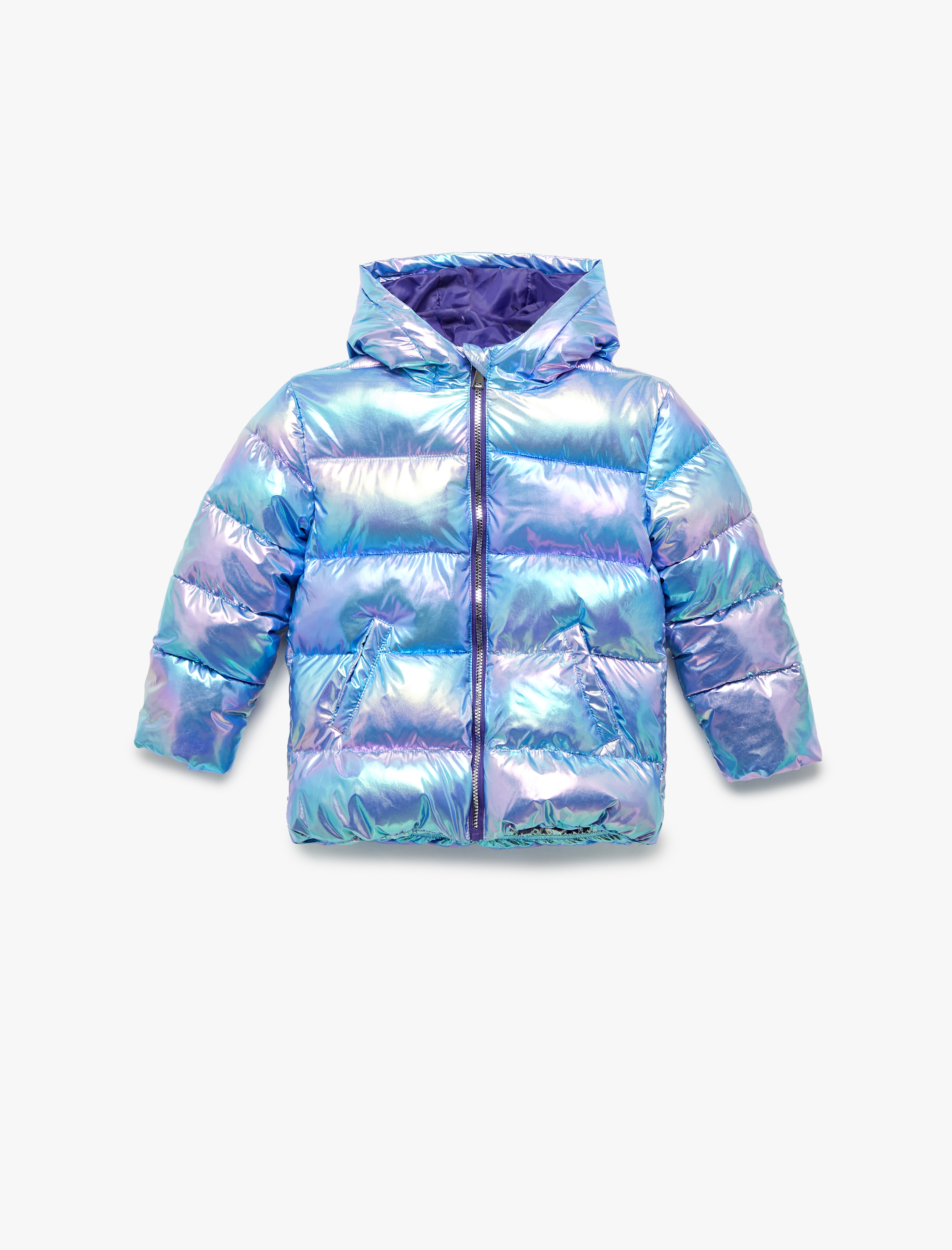 Kız Çocuk Kapşonlu Fermuarlı Parlak Şişme Mont
