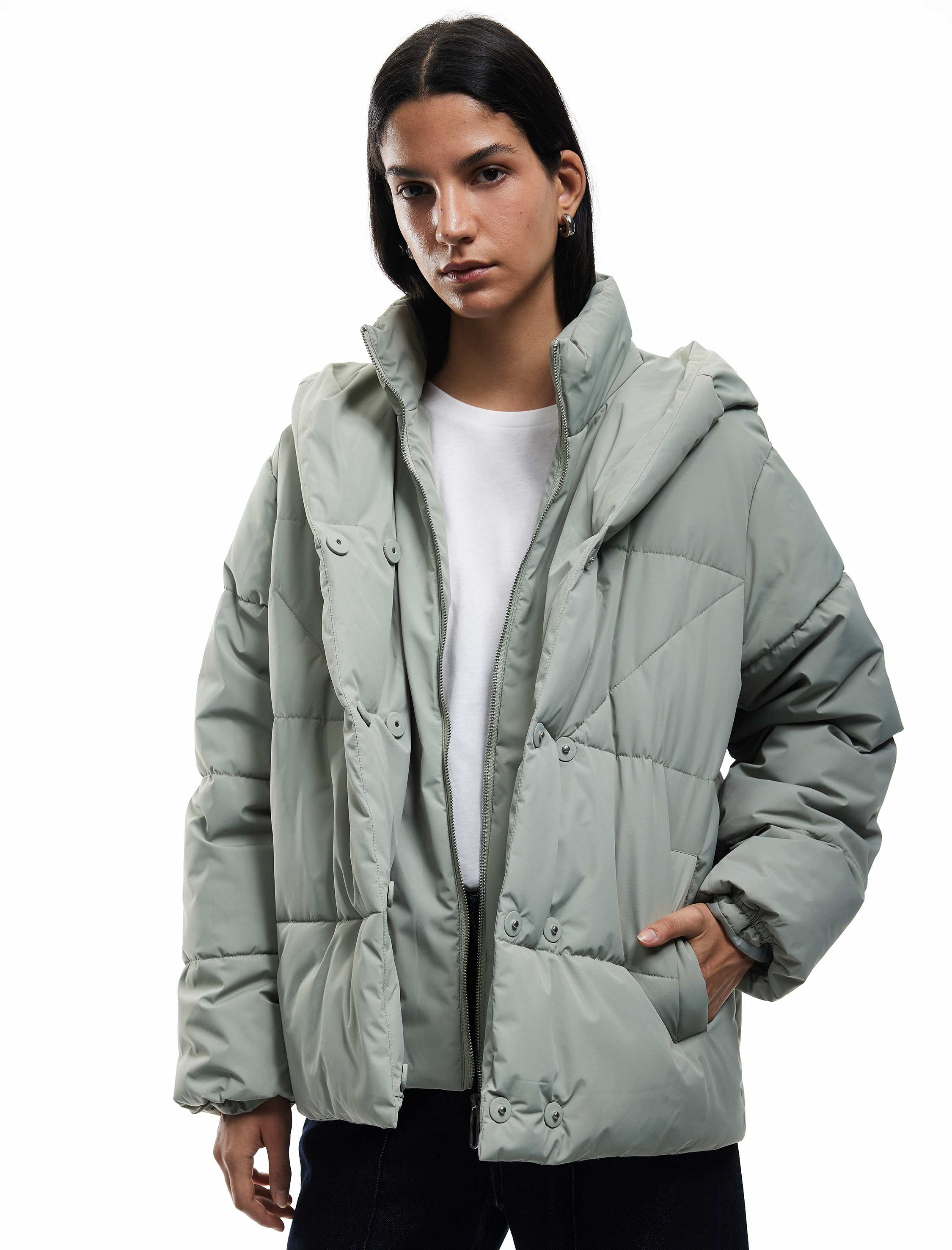Kapüşonlu Fermuarlı Düğme Detaylı Cepli Rahat Kalıp Kapitone Şişme Mont