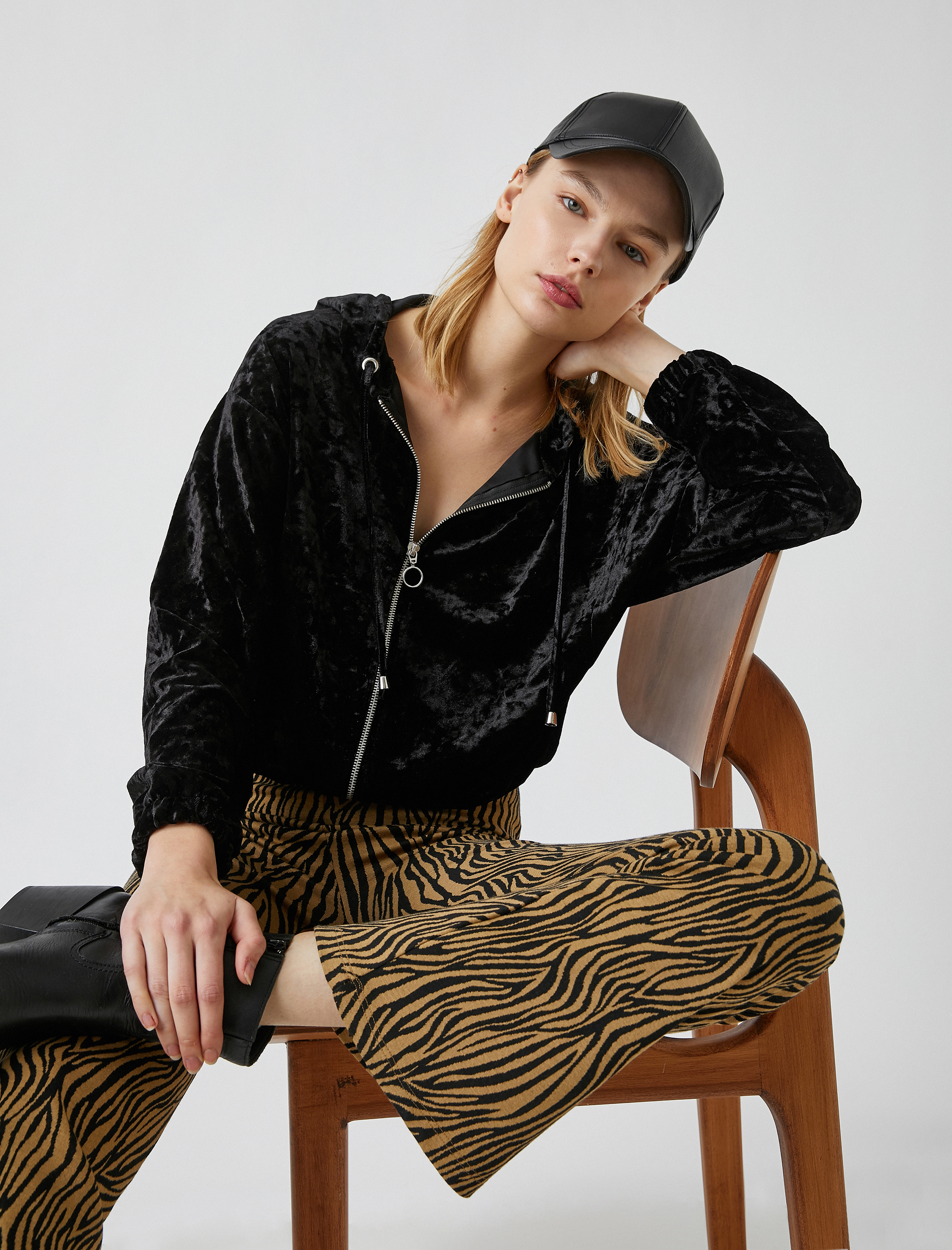 Kapüşonlu, Fermuarlı, Kadife Sweatshirt