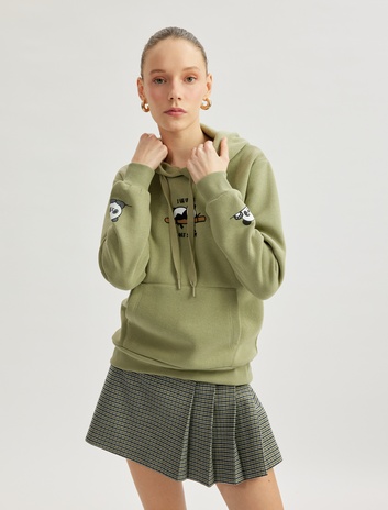 Üç İplik Şardonlu Nakış Detaylı Cepli Kapüşonlu Sweatshirt