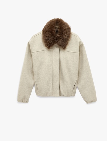 Uzun Kollu Cepli Çıkarılabilir Suni Kürk Yaka Kaşe Crop Bomber Ceket