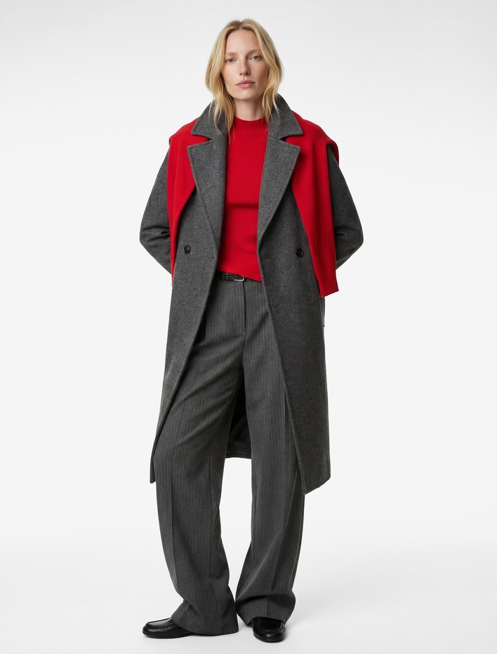 Uzun Kollu Düğmeli Cepli Atkılı Kaşe Ceket