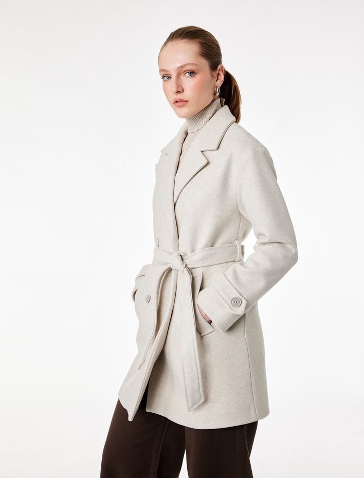 Uzun Kollu Düğmeli Cepli Kruvaze Kemerli Kısa Kaşe Kaban