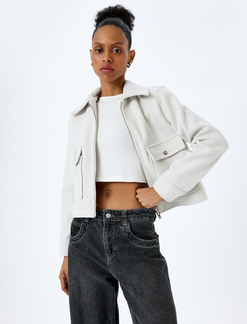 Cep Detaylı Fermuarlı Kaşe Crop Ceket Sepete Ekle