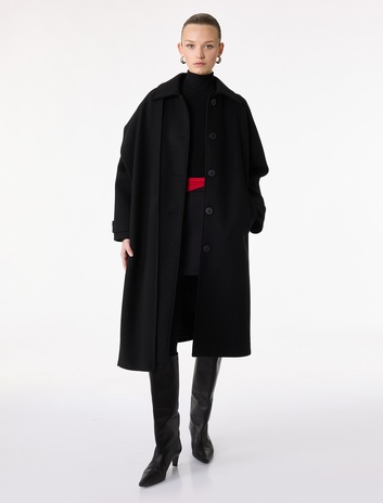 Regular Fit Uzun Kollu Cepli Çıkarılabilir Pelerinli Kemerli Uzun Kaşe Kaban
