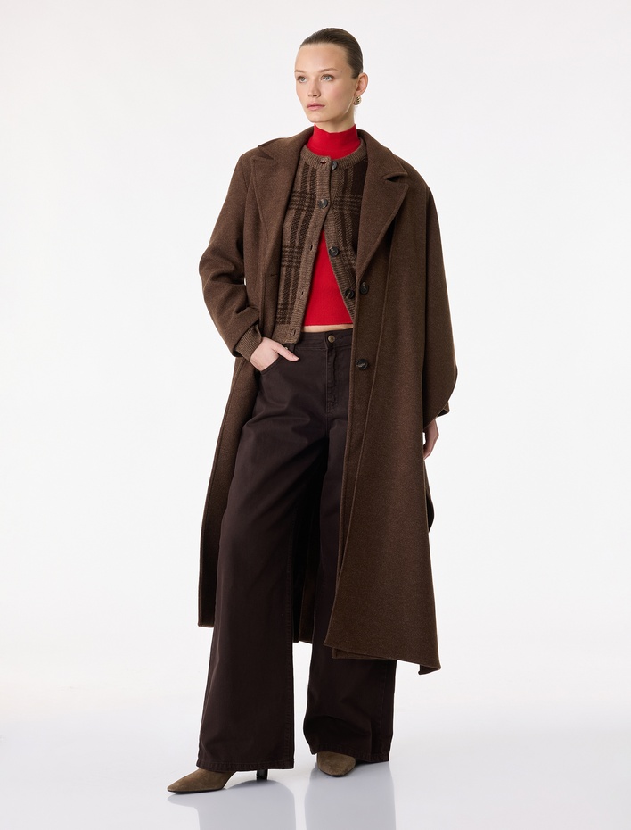 Uzun Kollu Cepli Düğmeli Kuşaklı Uzun Kruvaze Kaşe Kaban