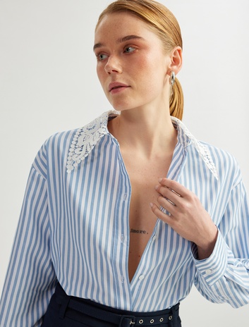 Dantel Yaka Detaylı Uzun Kollu Çizgili Oversize Gömlek