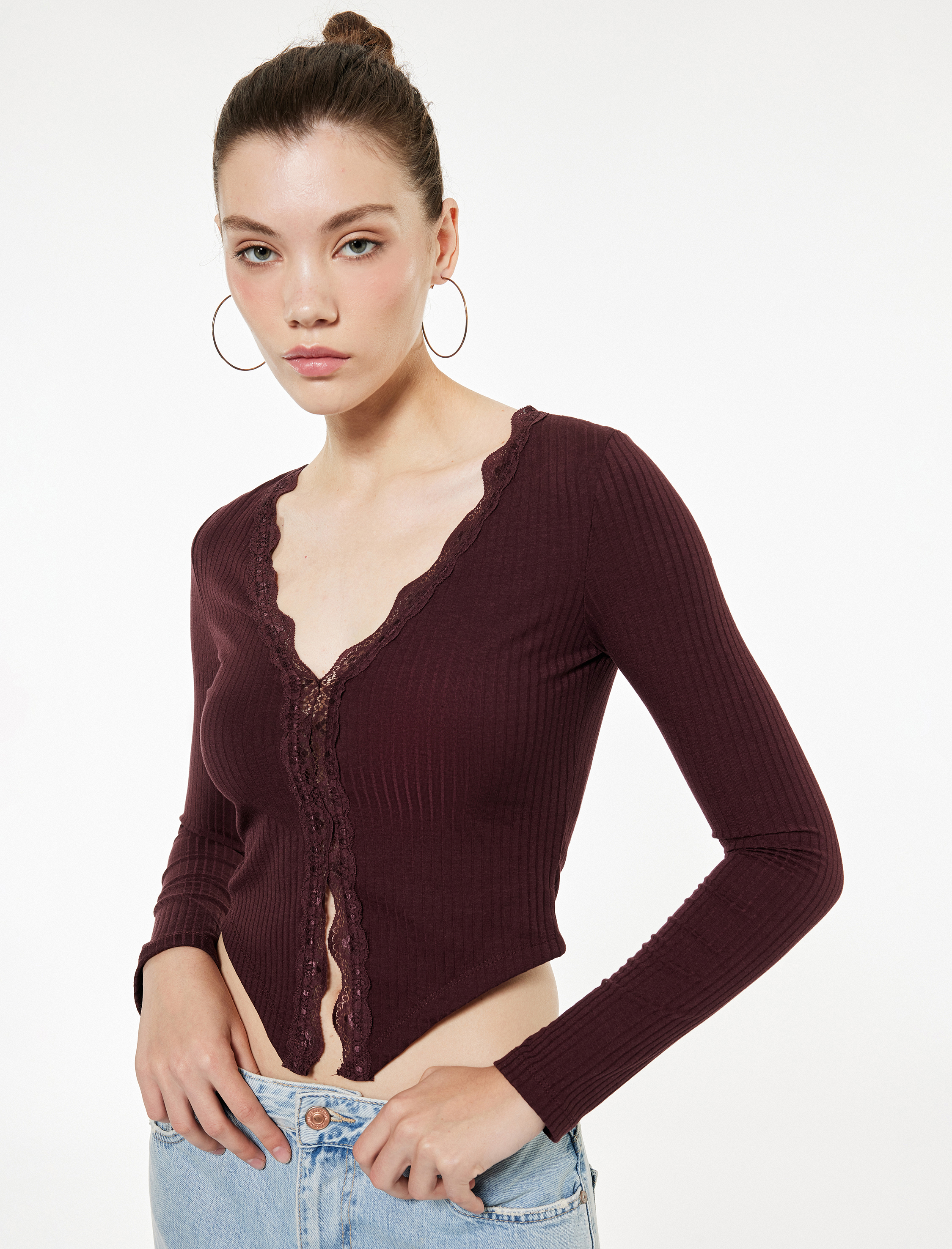 Kaşkorse Dantel Detaylı V Yaka Uzun Kollu Düğmeli Asimetrik Crop Tişört