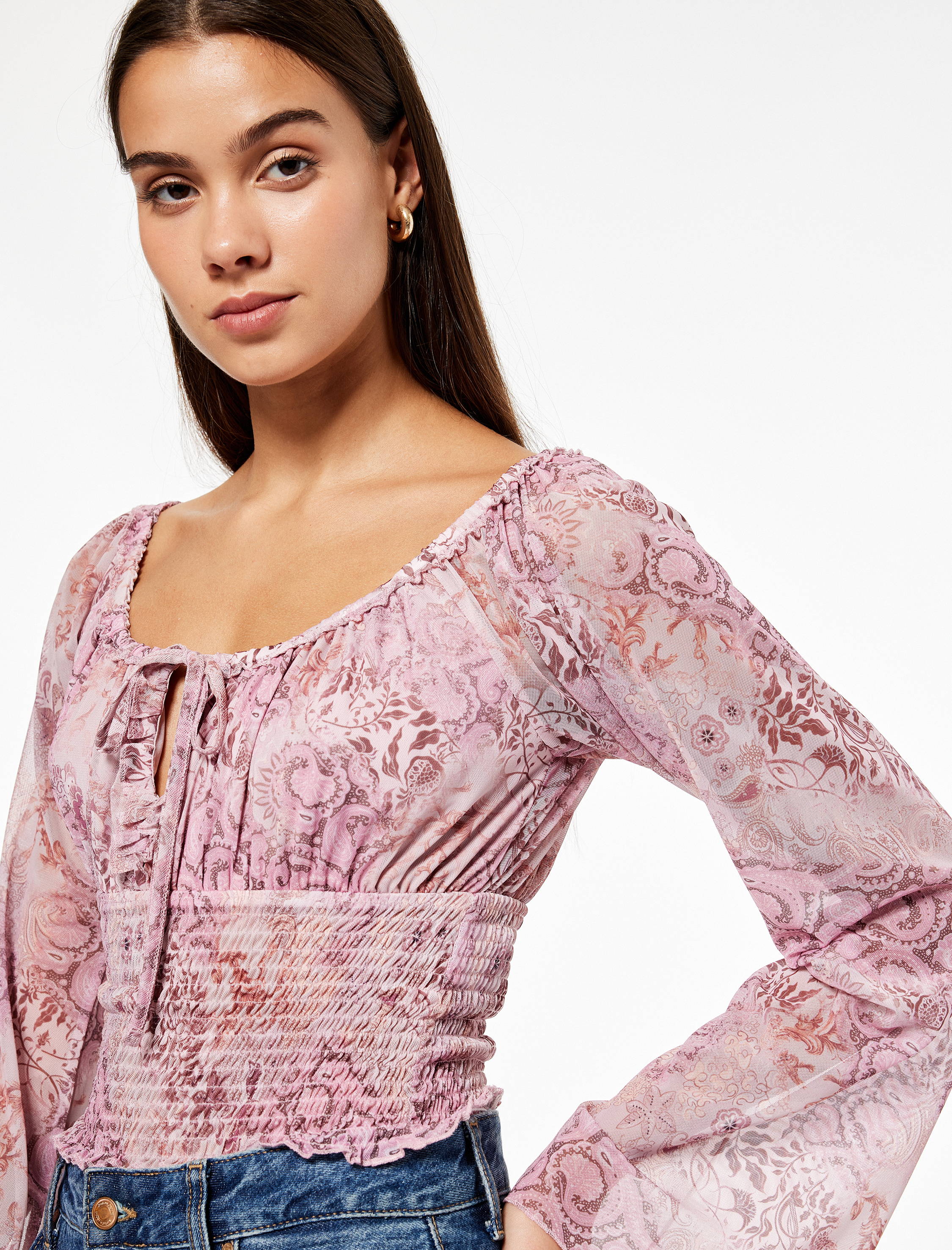 Kayık Yaka Uzun Kollu Bağcıklı Yaka Gipeli Şifon Bluz