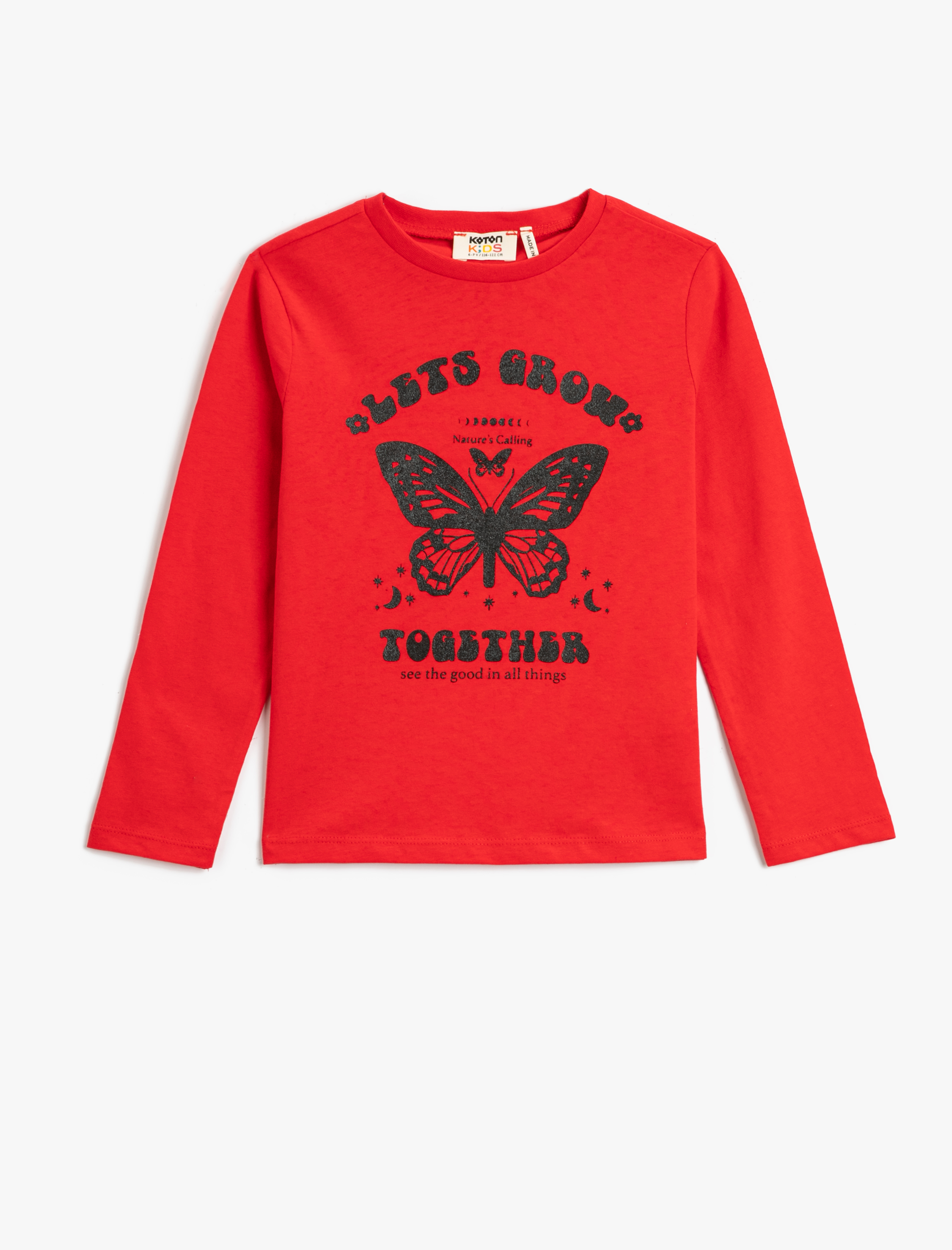 Kız Çocuk Kelebekli Tişört Uzun Kollu Bisiklet Yaka Baskılı Pamuklu