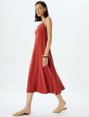 Koton X Melis Ağazat - Pencere Detaylı Keten Karışımlı Elbise Askılı Arkası Fiyonk Bağlamalı