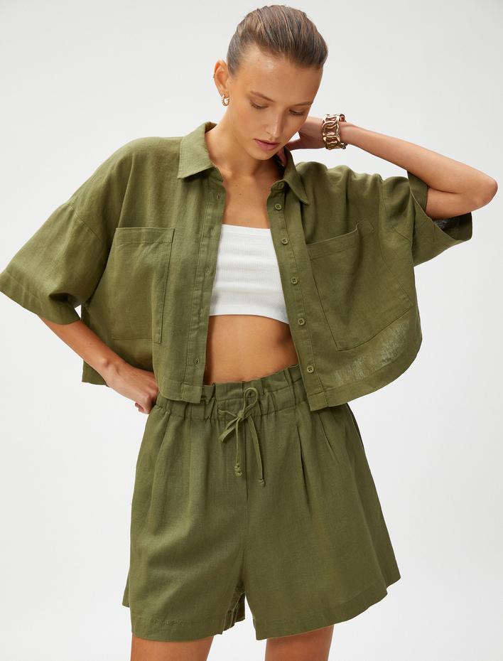 Crop Gömlek Kısa Kollu Cep Detaylı Düğmeli Keten Karışımlı Sepete Ekle