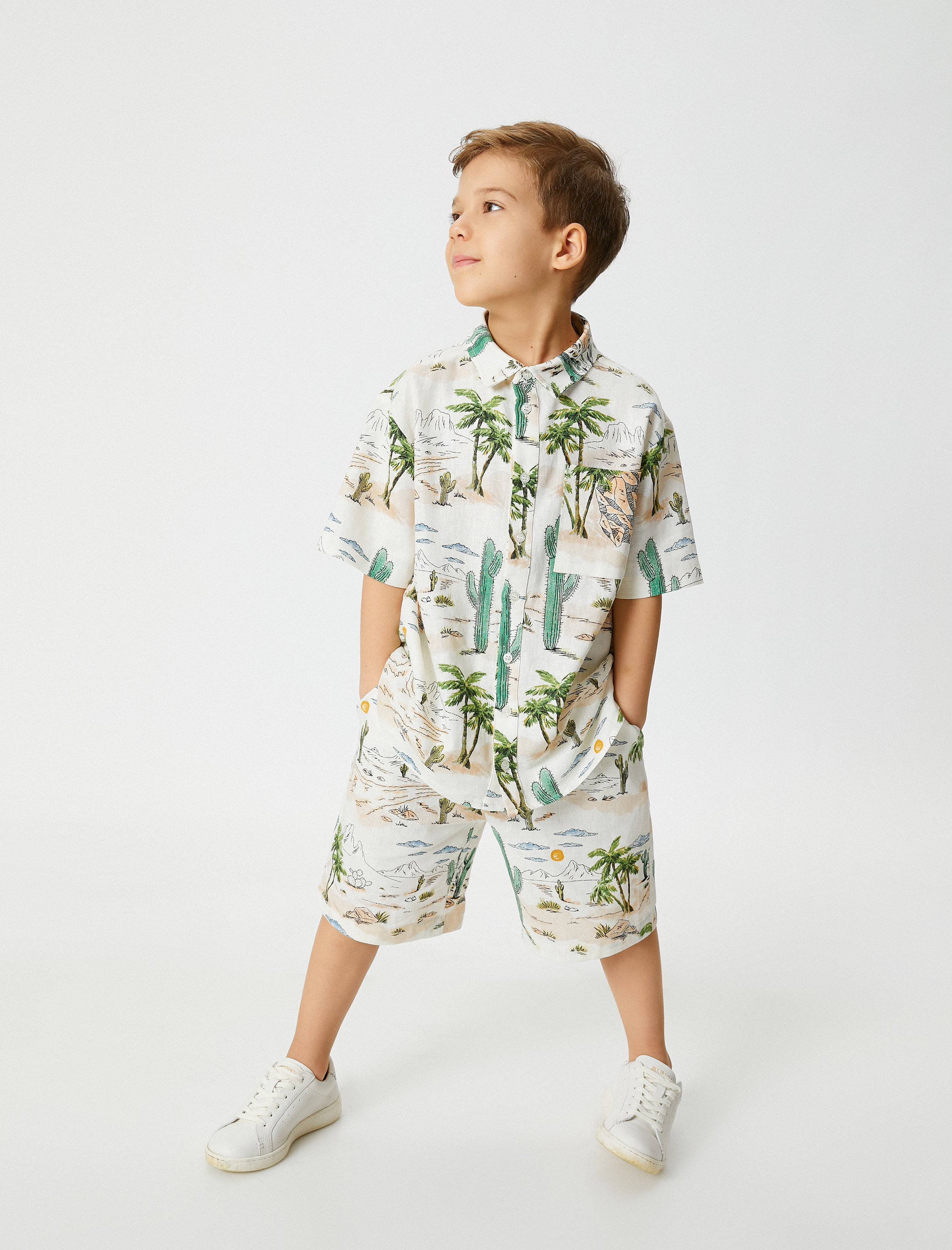 Erkek Çocuk Keten Gömlek Kısa Kollu Safari Desenli Tek Cepli