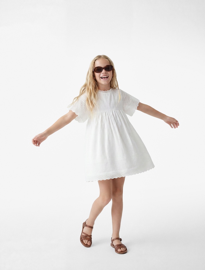 Bisiklet Yaka Kısa Kollu Fırfır Detaylı Brodeli Pamuklu Elbise Sepete Ekle