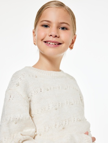 Kız Çocuk Uzun Kollu Bisiklet Yaka Boncuk Detaylı Triko Yılbaşı Kazağı