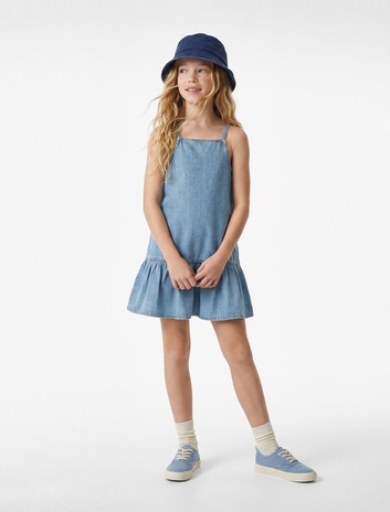 Kız Çocuk İp Askılı Oversize Pamuklu Pileli Denim Elbise