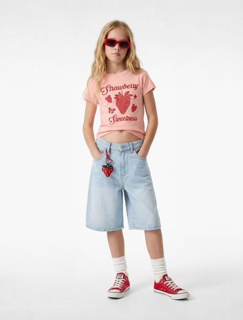 Pamuklu Bisiklet Yaka Kısa Kollu Çilek Baskılı Tişört Sepete Ekle
