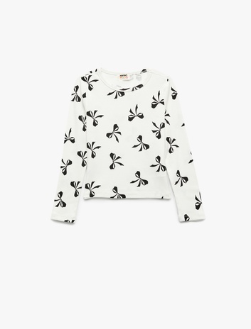 Kız Çocuk Fiyonk Desenli Uzun Kollu Bisiklet Yaka Pamuklu Tişört