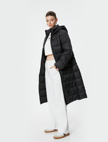Uzun Şişme Mont Kapüşonlu Fermuarlı Cepli Dolgulu Su İtici