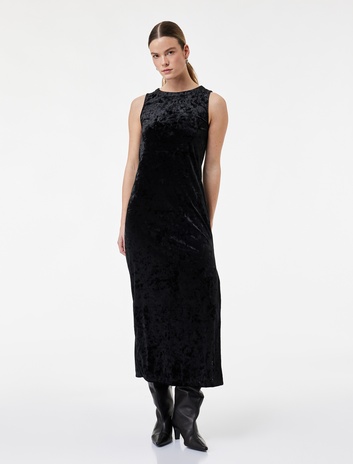 Midi Boy Kolsuz Yuvarlak Yaka Kadife Elbise