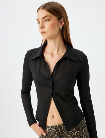 Gömlek Yaka Tül Bluz Simli Düğmeli Uzun Kollu Slim Fit Sepete Ekle