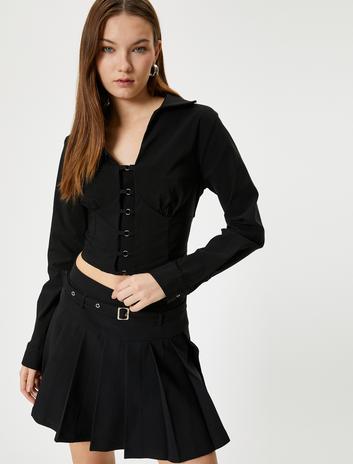 Crop Bluz Uzun Kollu Slim Fit Gömlek Yaka Önü Metal Aksesuar Detaylı Sepete Ekle