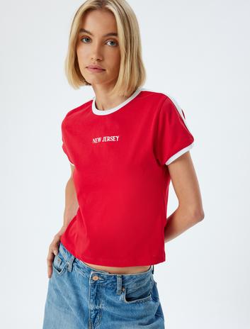 Kısa Kollu Tişört Bisiklet Yaka Nakışlı Pamuklu