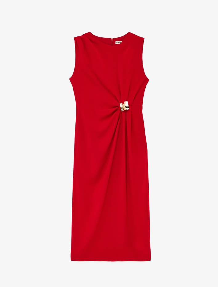 Krep Kumaş Aksesuarlı Drapeli Kolsuz Bisiklet Yaka Uzun Elbise Sepete Ekle