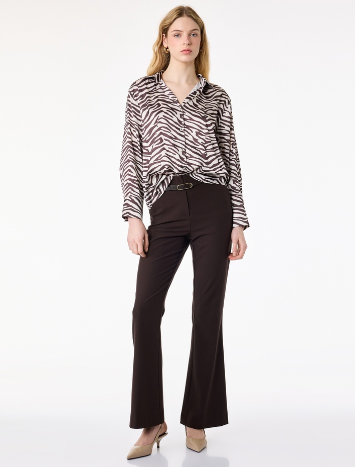 Uzun Kollu Düğmeli Zebra Desenli Klasik Yaka Saten Gömlek