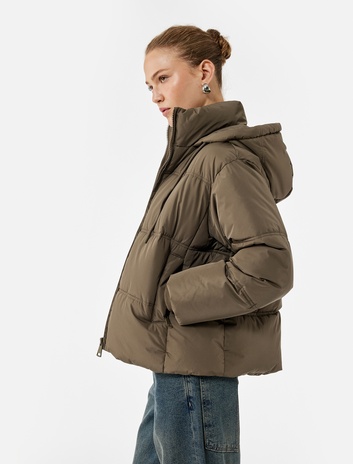 Çıtçıt Düğme Detaylı Fermuarlı Cepli Kapüşonlu Kışlık Şişme Ceket
