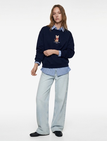 Şardonlu Uzun Kollu Bisiklet Yaka Köpek Baskılı Oversize Sweatshirt Sepete Ekle