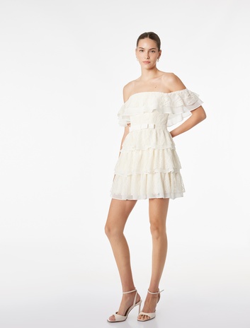 Kısa Kollu Kare Yaka Omzu Açık Fiyonklu Katlı Mini Dantelli Elbise