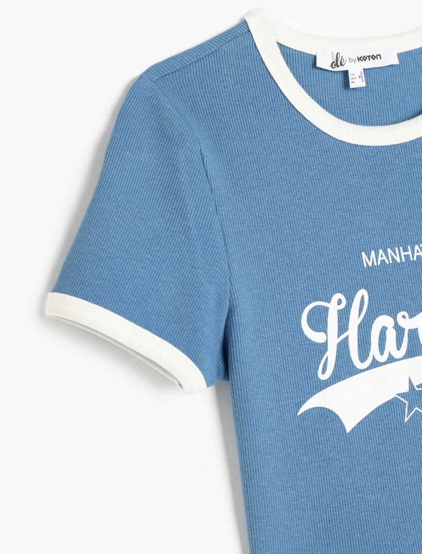 Kısa Kollu Bisiklet Yaka Kolej Baskılı Biyeli Crop Tişört
