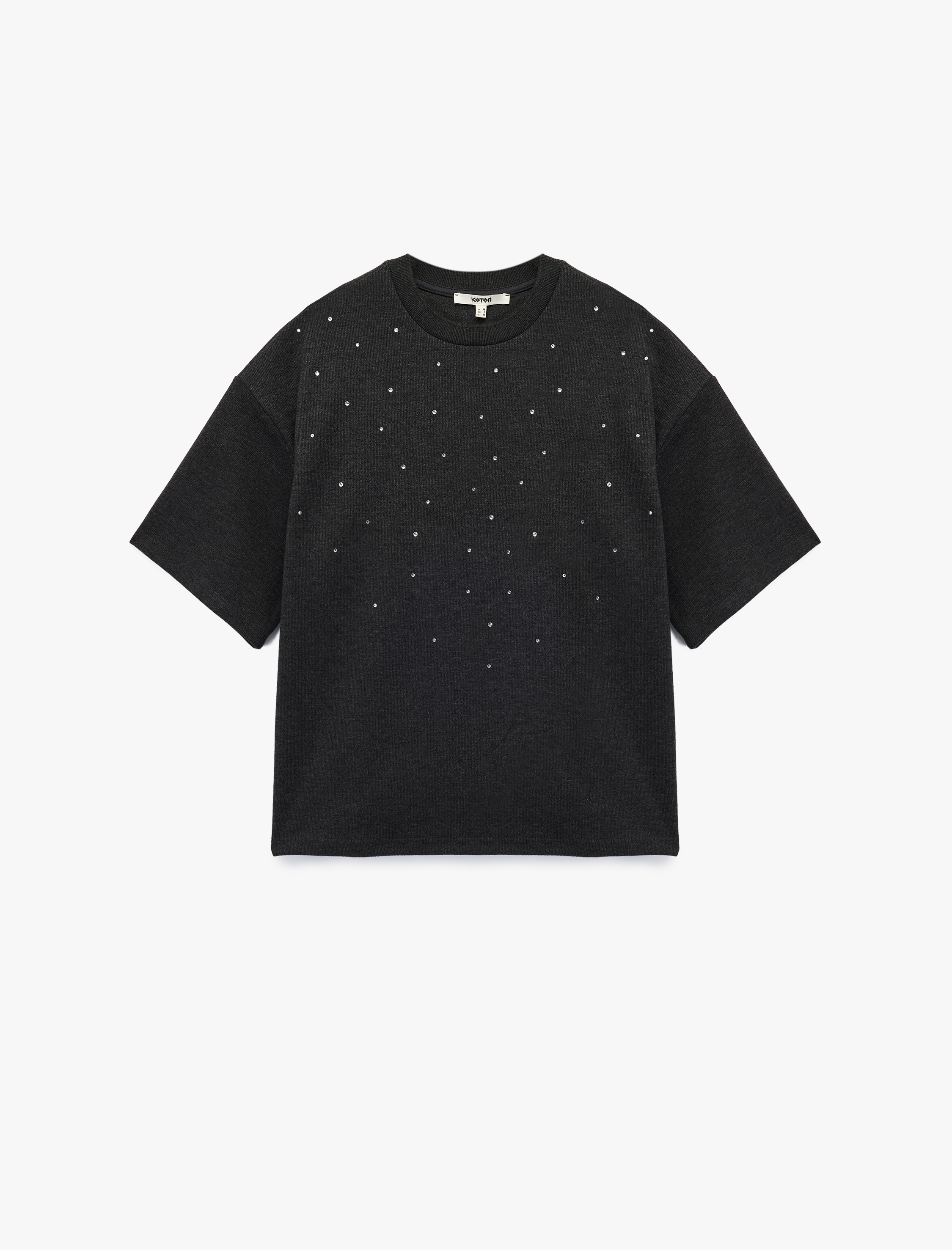 Kısa Kollu Bisiklet Yaka Taş Detaylı Tişört