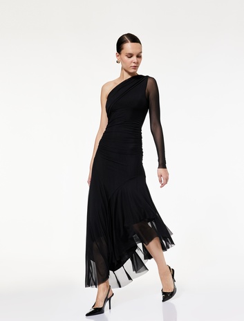 Uzun Kollu Asimetrik Etek Ucu Detaylı Midi Boy Tek Omuz Tül Elbise