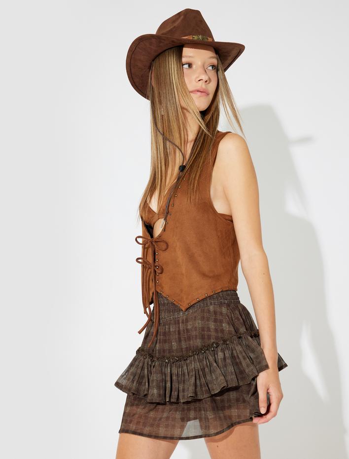Süet Görünümlü Metal Boncuk Detaylı Püsküllü Mini Etek Sepete Ekle