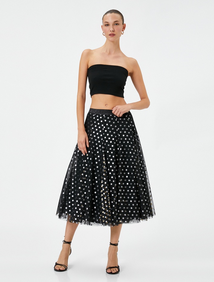 Midi Tüllü Etek Simli Katlı Puantiye Desenli Sepete Ekle