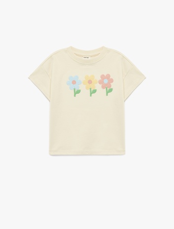 Kısa Kollu Bisiklet Yaka Çiçek Nakışlı Pamuklu Tişört Sepete Ekle