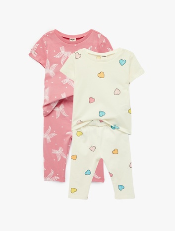 Kalp Desenli Kısa Kollu Bisiklet Yaka Pamuklu Tişört Şort Takım - 2'li Set Sepete Ekle