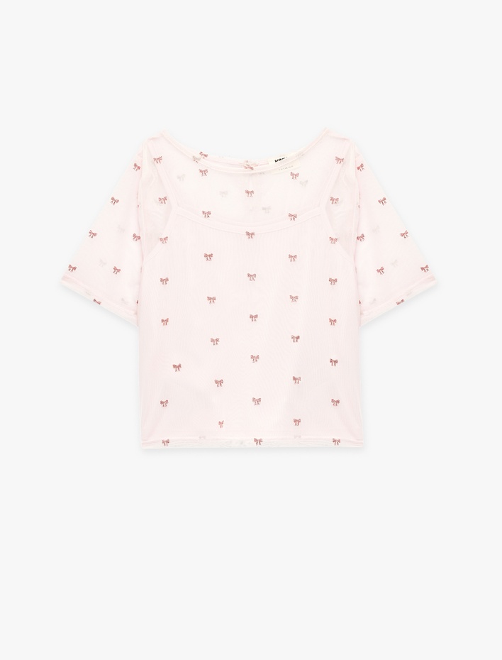 Tül Katmanlı Kısa Kollu Bisiklet Yaka Fiyonk Baskılı Bluz Sepete Ekle