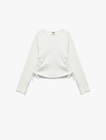 Pamuklu Uzun Kollu Büzgü Detaylı Bisiklet Yaka Crop Tişört Sepete Ekle