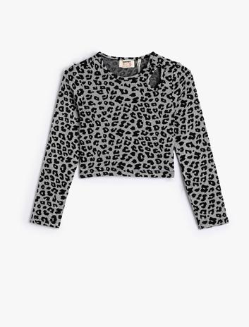 Crop Tişört Pencere Detaylı Uzun Kollu Leopar Desenli Yuvarlak Yaka Sepete Ekle