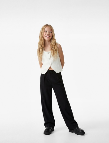 Kız Çocuk Kolsuz Kare Yaka Düğmeli Crop Tüvit Bluz