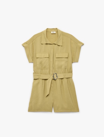 Kısa Kollu Gömlek Yaka Cepli Kemerli Modal Kısa Tulum Sepete Ekle