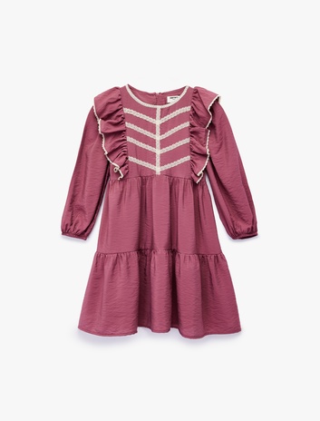 Kız Çocuk Uzun Kollu Bisiklet Yaka Volanlı Viskon Elbise