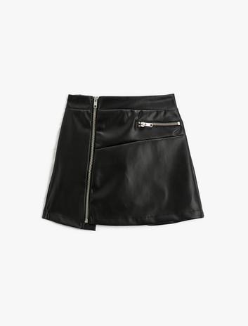 Mini Etek Suni Deri Görünümlü Fermuarlı Asimetrik Kesim Cepli Sepete Ekle