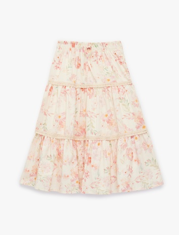 Pamuklu Çiçek Desenli Katlı Volanlı A Kesim Uzun Etek Sepete Ekle